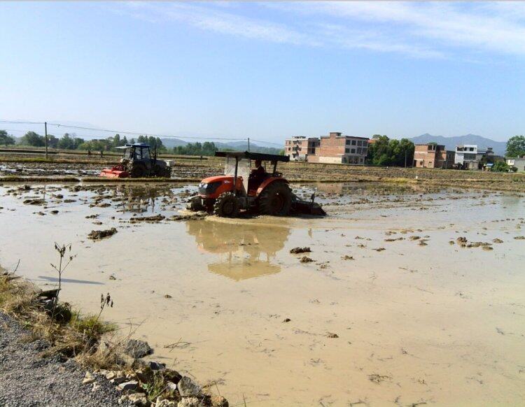日前,笔者在祁阳县白水镇新中村平坦的田野上看到,一台台大中型拖拉机带动着旋耕农具穿梭作业,呈现出一幅机声隆隆闹春耕的繁忙景象。